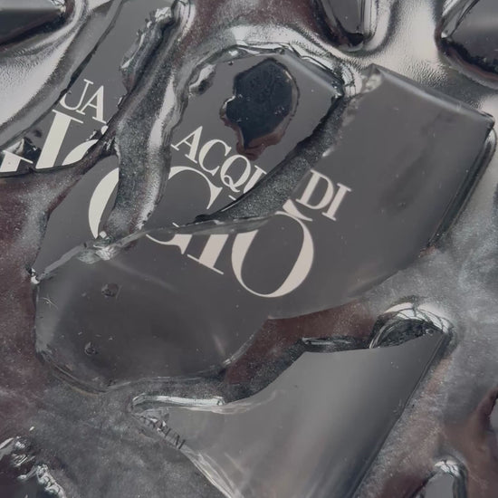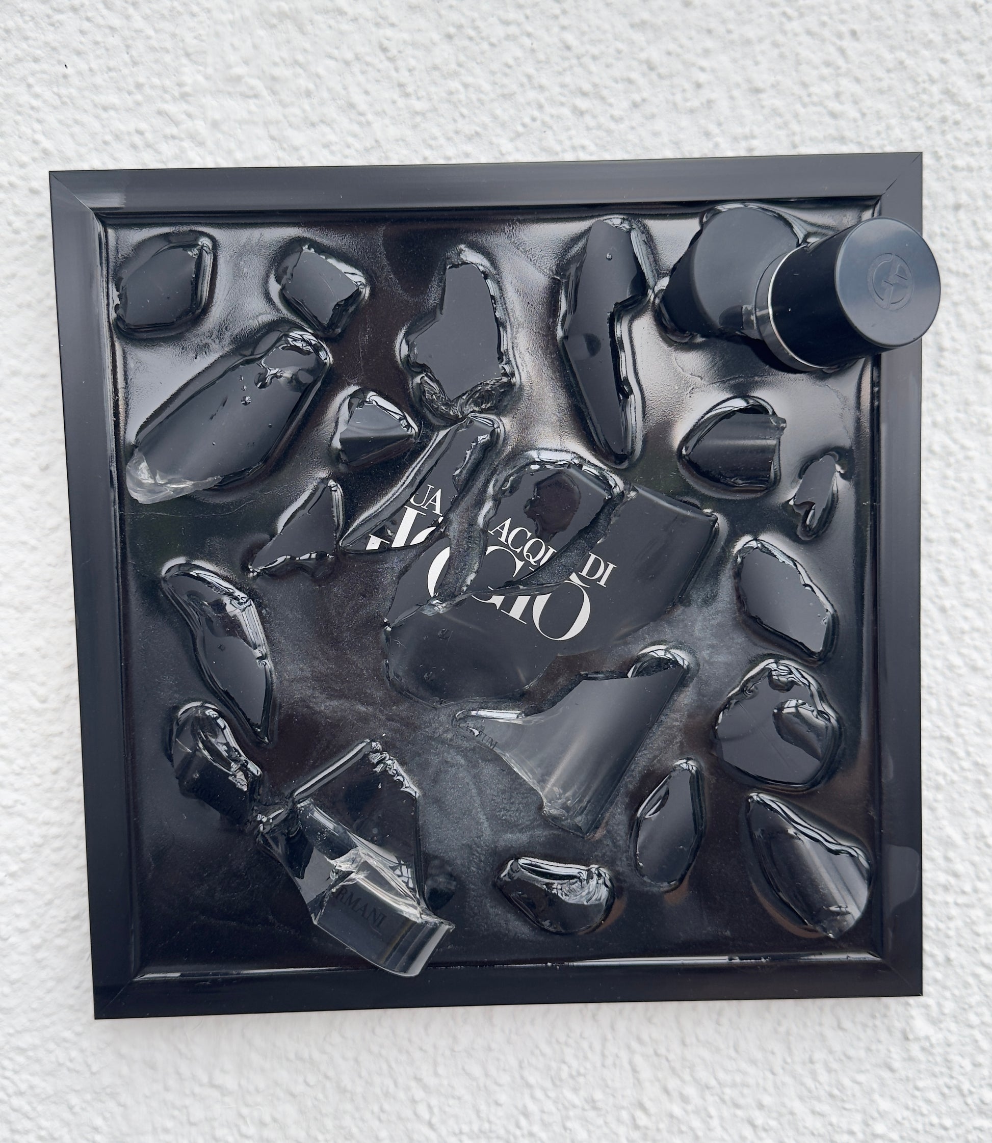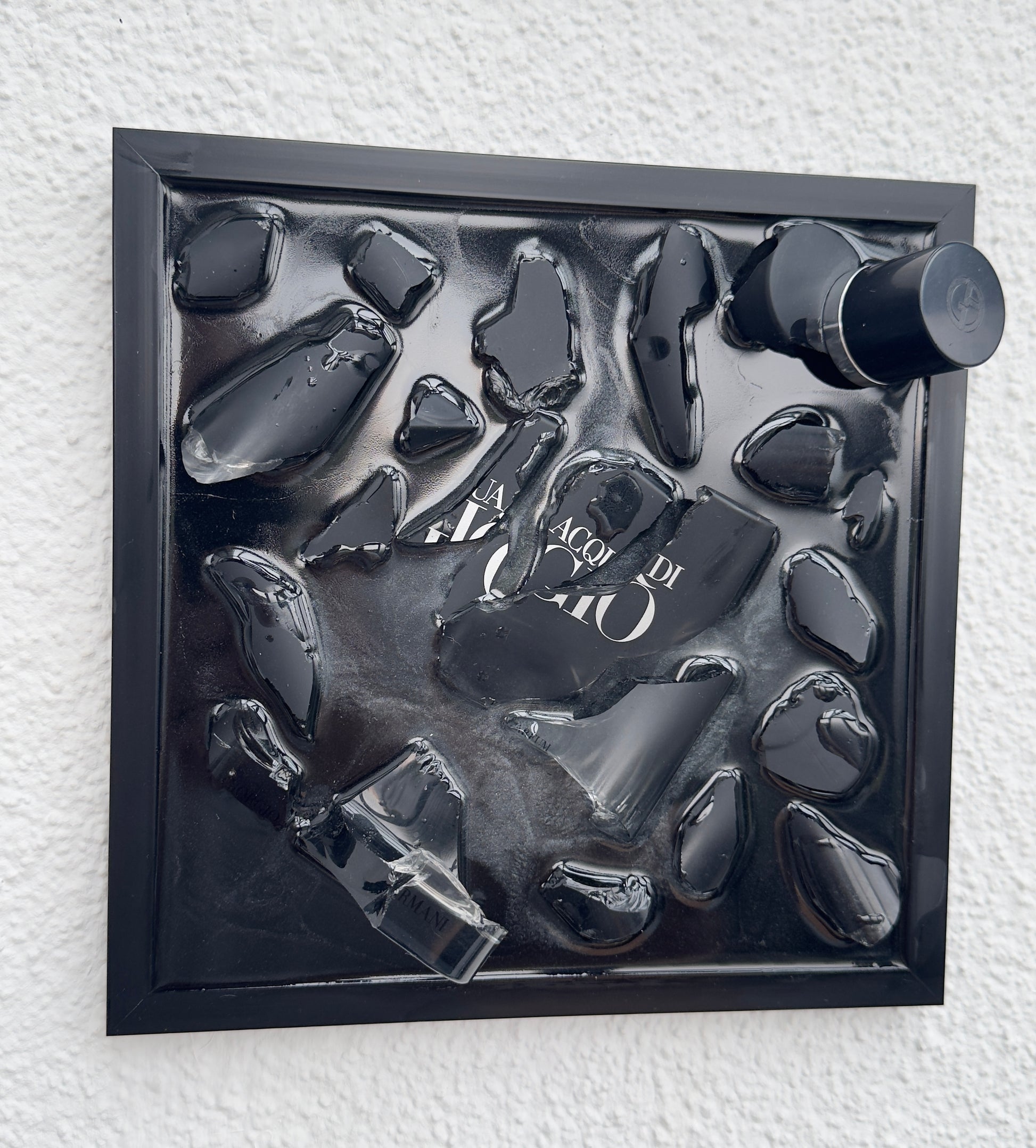 Dieses außergewöhnliche Upcycling-Kunstwerk verbindet Luxus, Design und Nachhaltigkeit. In einem schwarzen Rahmen arrangiert, wurden Fragmente eines originalen Georgio Armani Acqua di Gio Eau de Parfum Flakons zu einem modernen 3D-Wandobjekt verarbeitet.